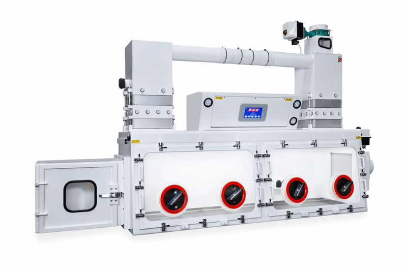Operators interact with materials via integrated glove ports, ensuring a complete physical barrier between user and hazardous substances.