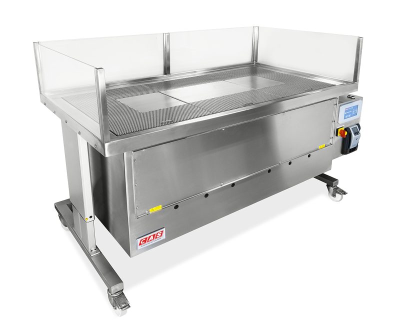 Using a constant downward airflow, the downflow table pulls airborne contaminants, fumes, and particles away from the operator through a perforated work surface and into a multi-stage filtration system. Clean air is then safely discharged back into the environment.